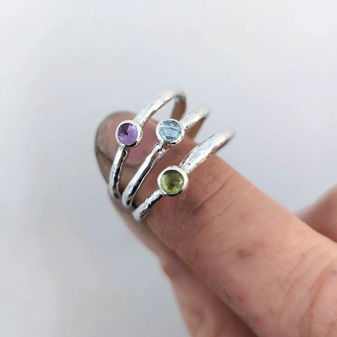 This ring is a sample piece and is listed at a special reduced price. This pretty 4mm Amethyst stone has been set atop an organic, molten style band, handcrafted in the studio from 100% recycled sterling silver. Amethyst promotes positive transformation, inner peace & healing.