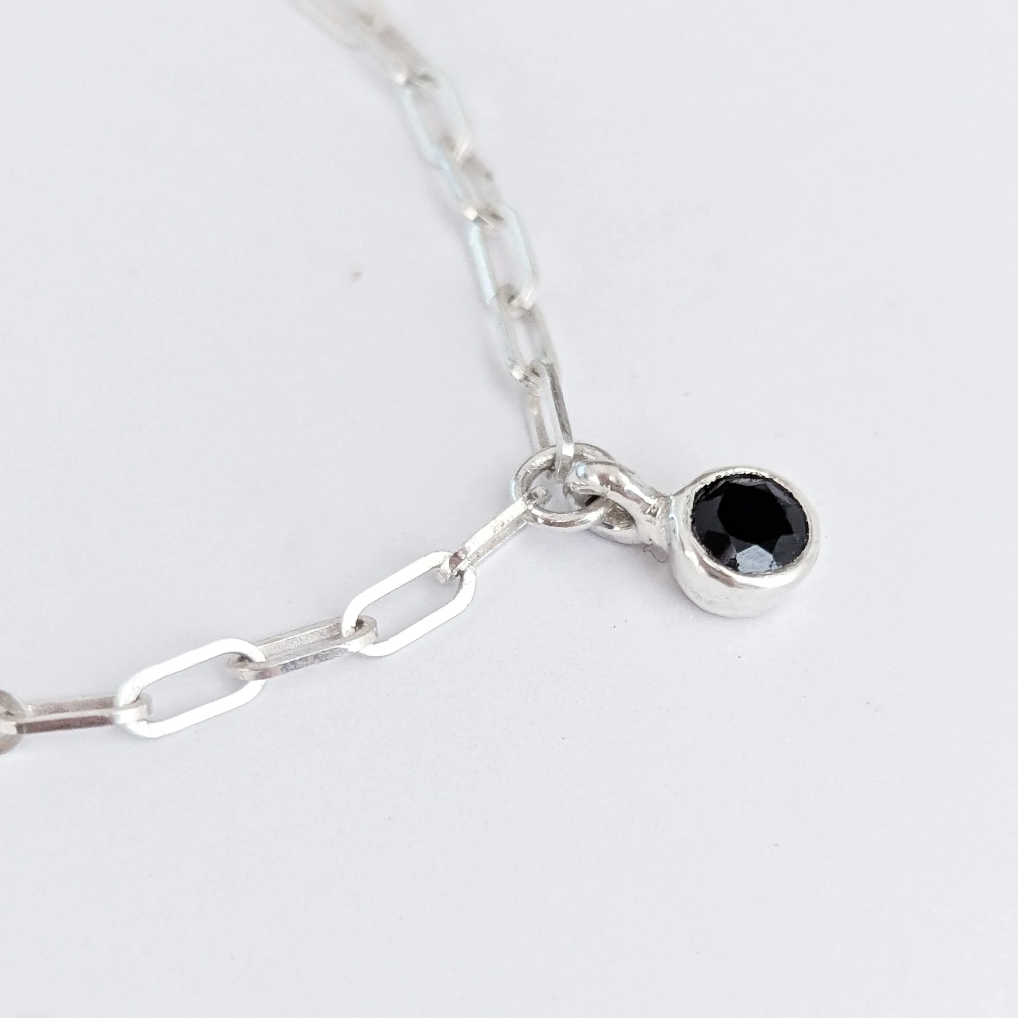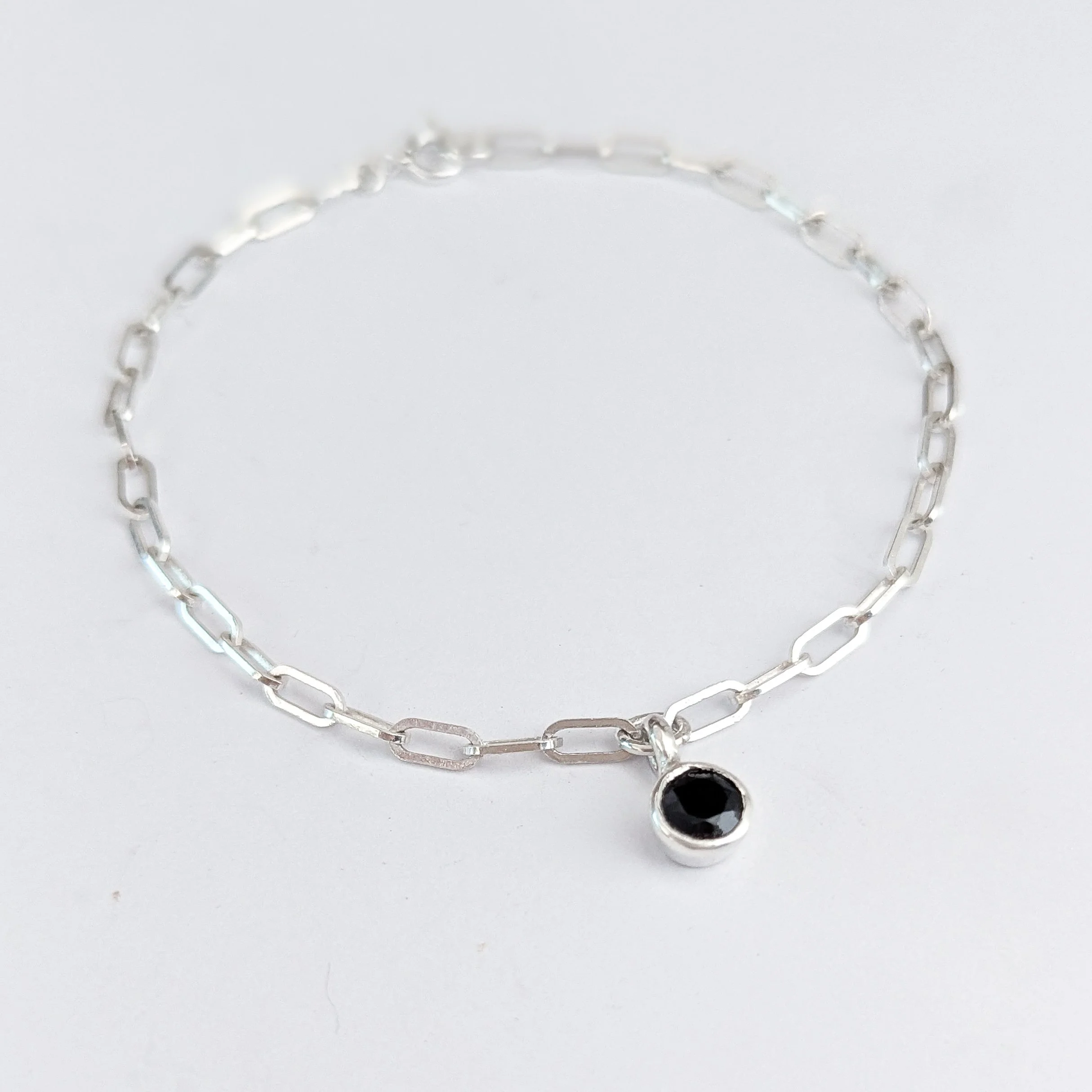This bracelet is a sample piece and is listed at a special reduced price. This beautiful Black Spinel stone has been set in a handcrafted bezel style setting with an open back and suspended on a trace style chain. Handmade from 100% recycled sterling silver. Black Spinel is a grounding + protection stone.