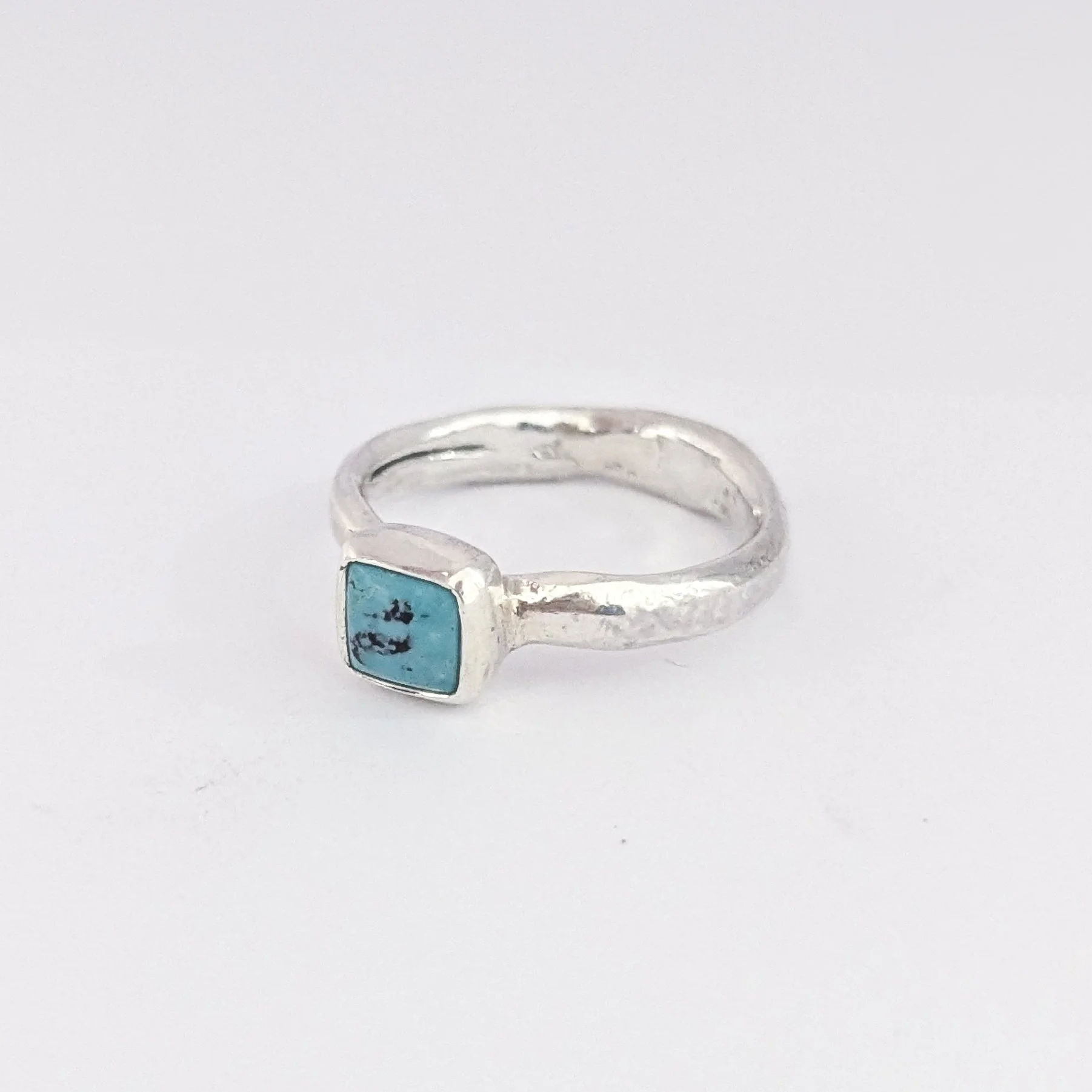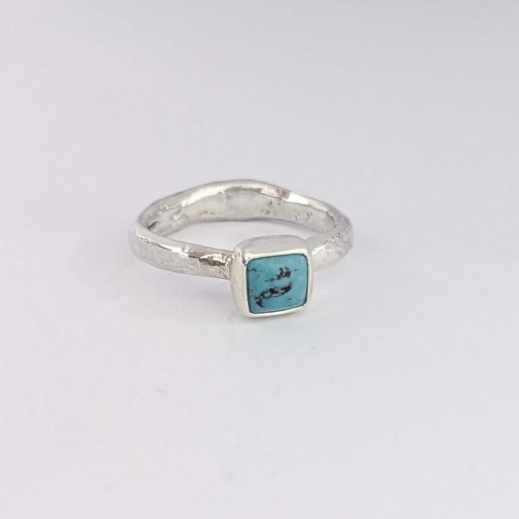 This ring is a sample piece and is listed at a special reduced price. Inspired by ancient jewellery with subtle markings and organic textures as though weathered by the tide, this ring has been handcrafted in the studio from 100% recycled sterling silver and set with a Turquoise stone.