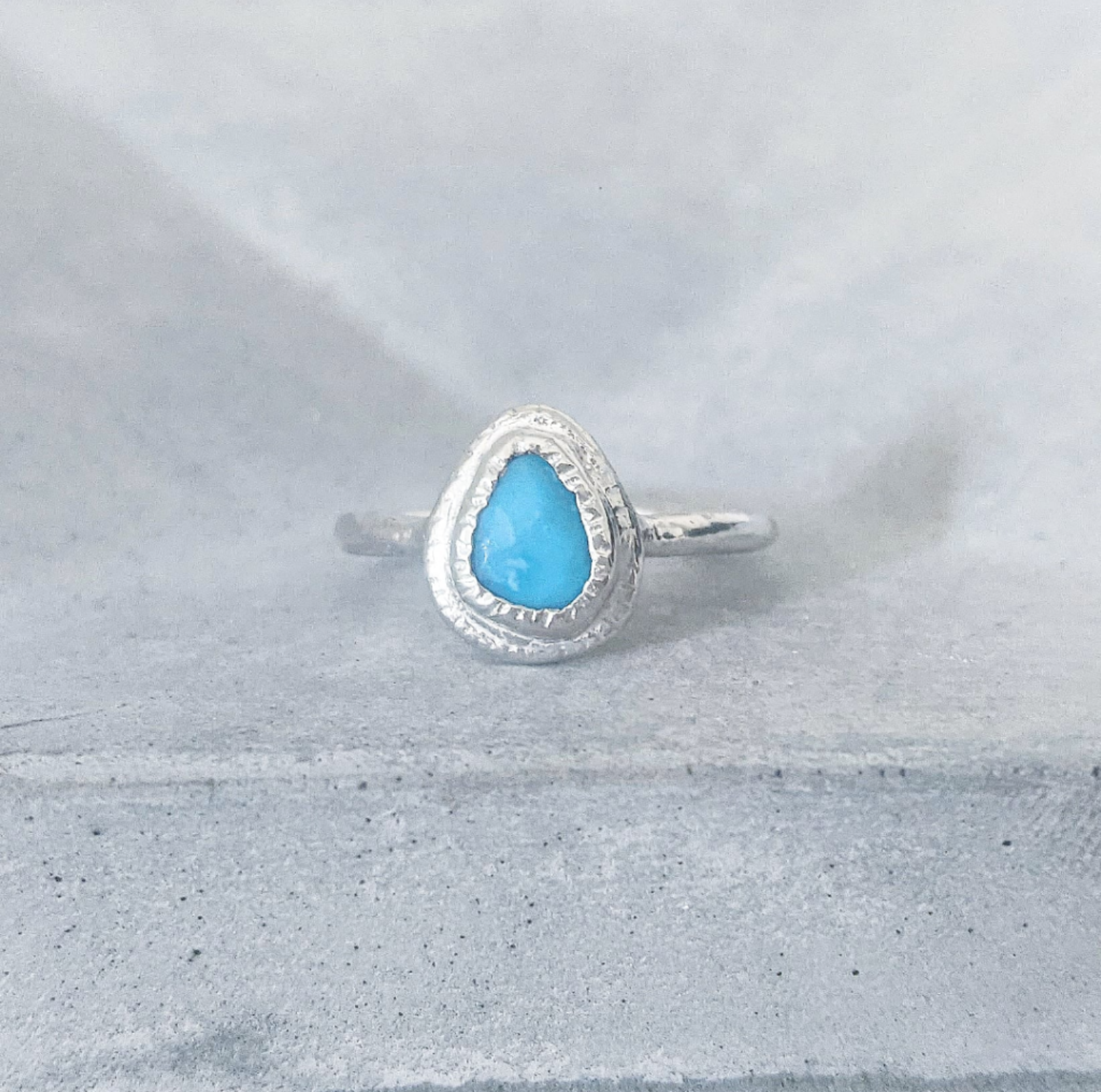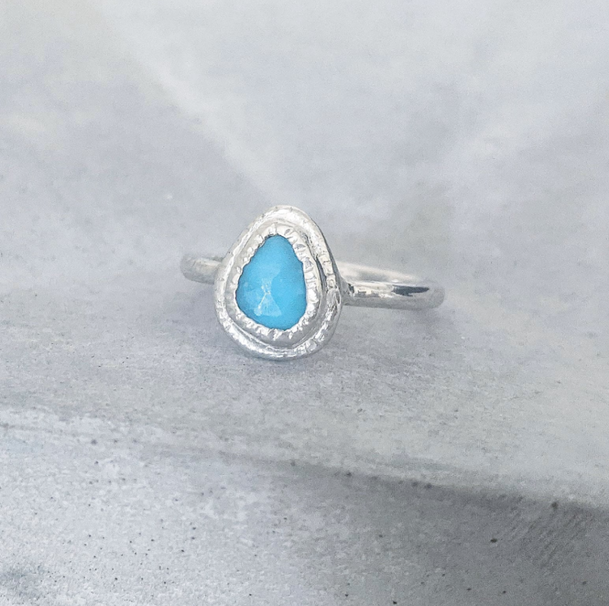 This one of a kind ring has been hand fabricated using recycled sterling silver, set with a beautiful Turquoise stone. Named after the goddess of mythology, wisdom and crafts, I’ve made this one with a particularly rustic/ancient style setting. Turquoise is a protection stone, also said to promote kindness, friendship & peace.