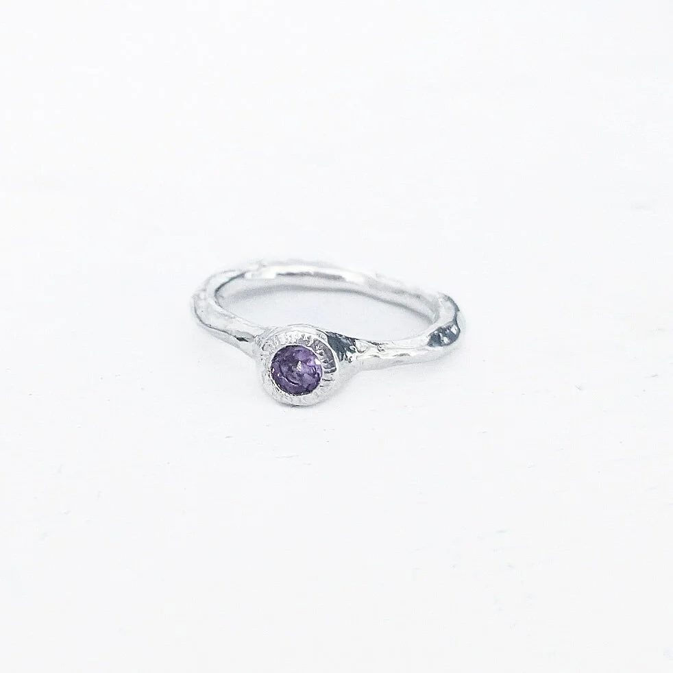 This one of a kind ring has been hand fabricated using recycled sterling silver, with a beautiful Amethyst stone set amidst an organic band. Amethyst is known for it’s grounding qualities, promoting calm and tranquility. This ring was inspired by a kayak trip we took as the sun rose over Maligne Lake in Jasper. The purple hues of the Amethyst represent the shade of the sky and the texture of the band represents the rocky mountains that surrounded us.