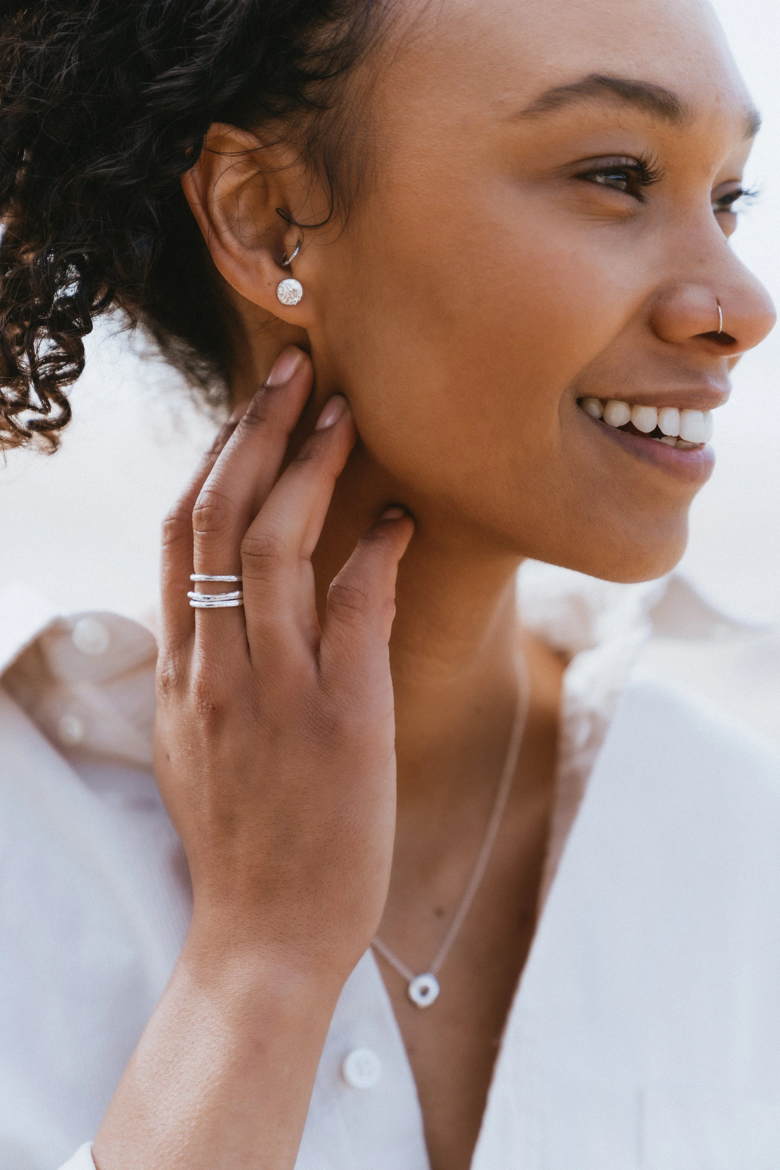 Create your own stack set by mixing + matching my Classic and Roman stack ring designs. This option will give you a bit of discount on a set of 3 instead of purchasing the rings separately. The Classic stack ring has my signature rustic, organic texture, the Roman stack ring design has additional notches embedded around the band to give a more ancient look. They look really great together when you mix and match! Handmade from 100% recycled sterling silver.